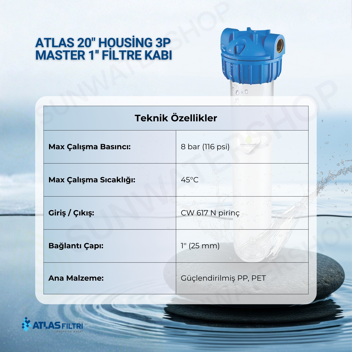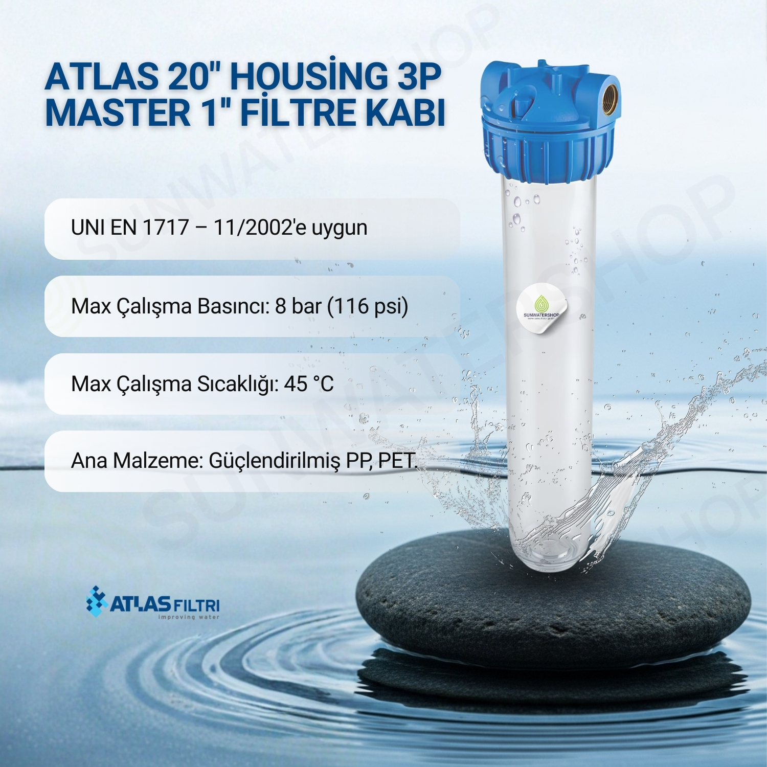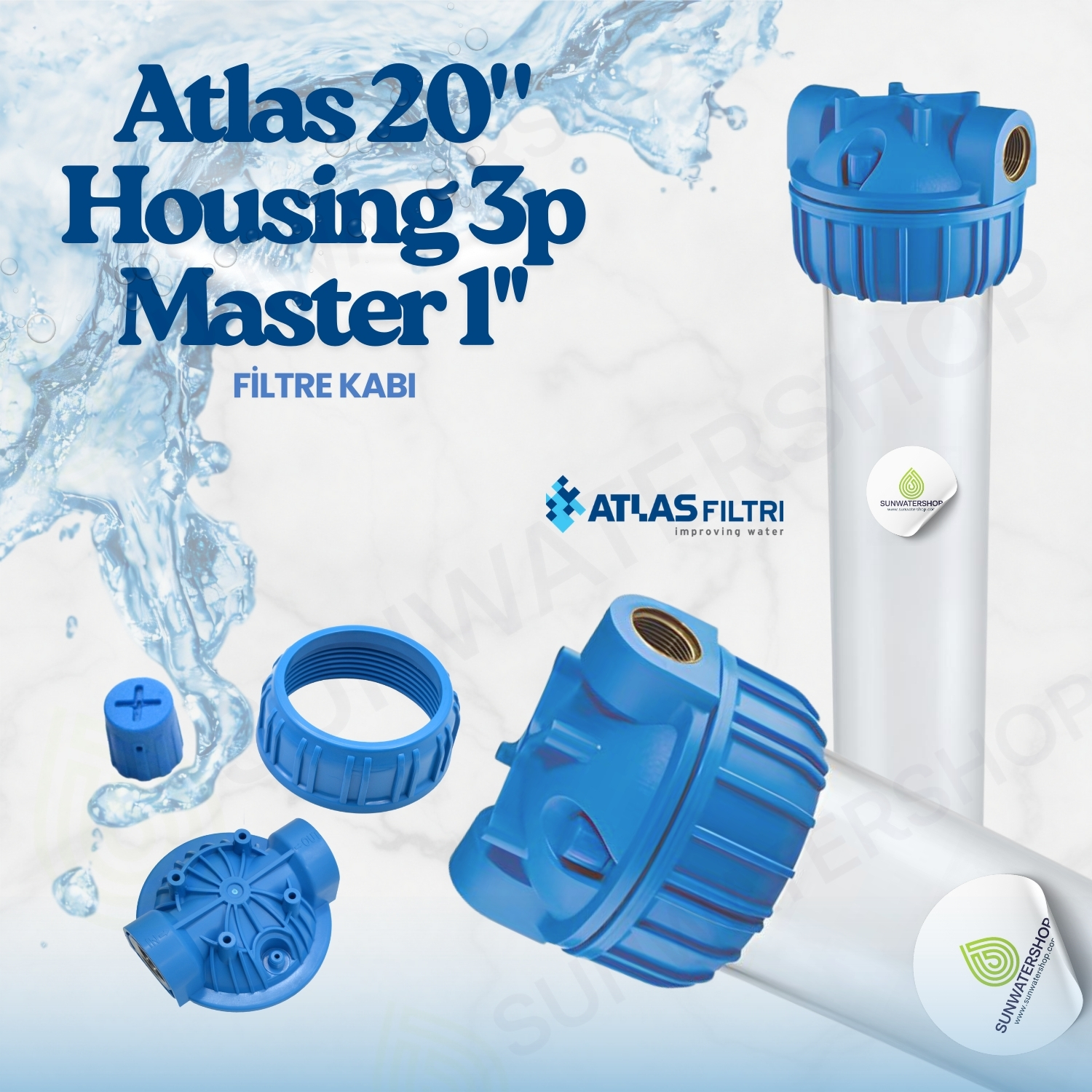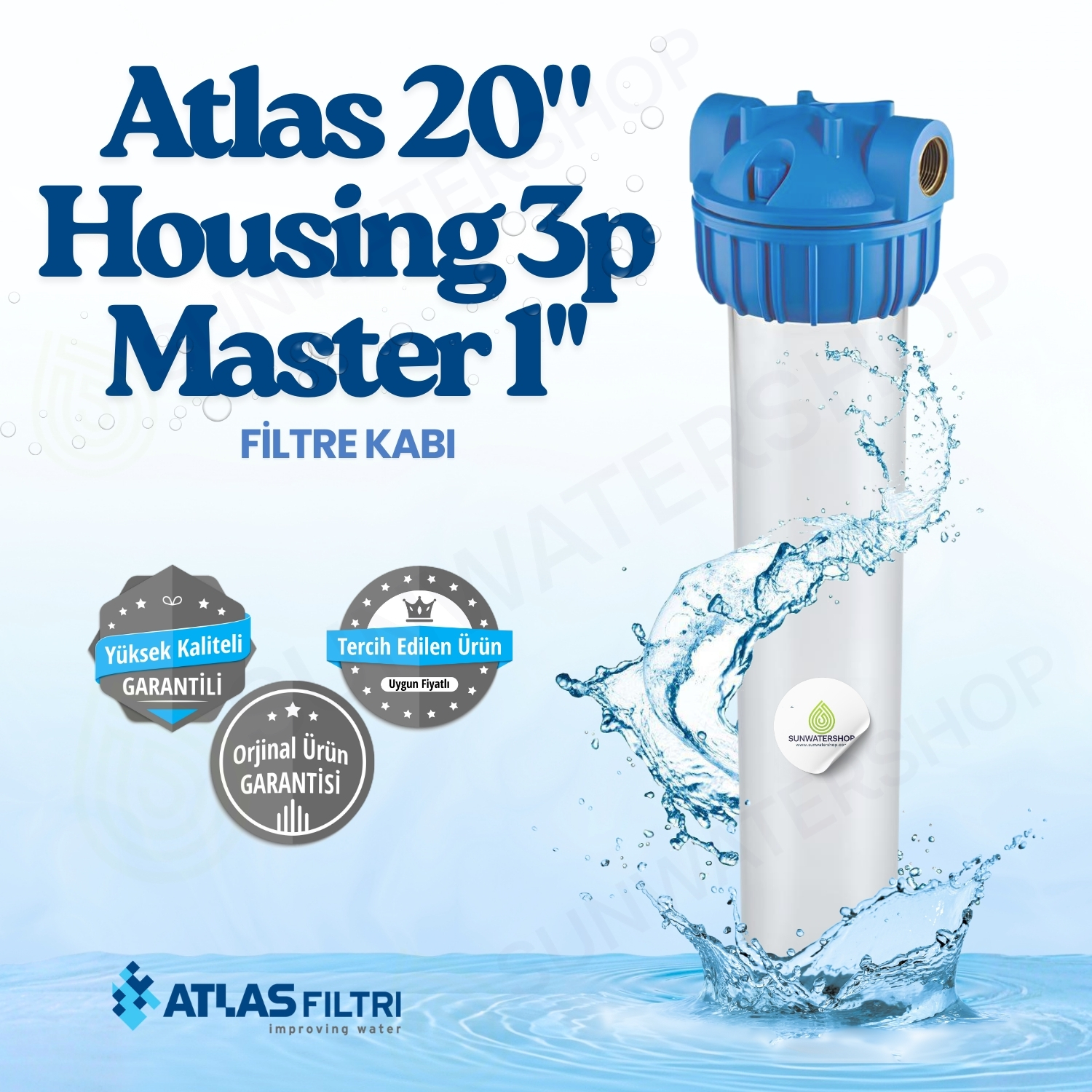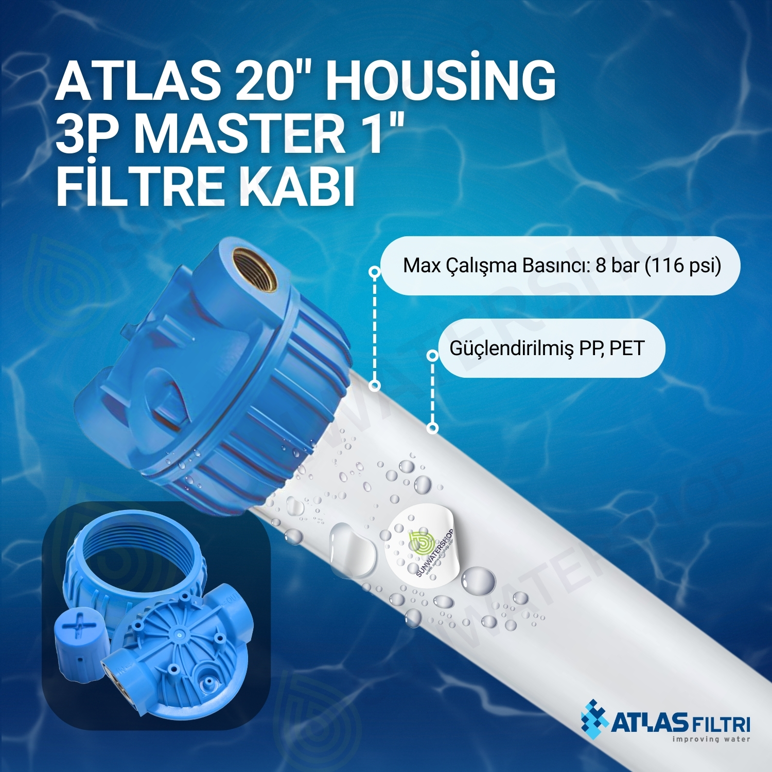 Atlas 20" Housing 3P Master 1'' filtre kabı hem evsel hem endüstriyel su arıtma sistemlerinde kullanılabilir. Geniş filtre uyumluluğu sayesinde evsel/endüstriyel kullanımlarda tercih edilir.