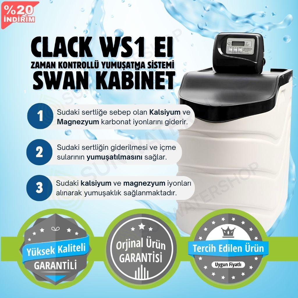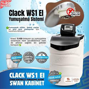 Clack WS1 EI (SWAN KABİNET) Debi Kontrollü Yumuşatma Sistemi, Evlerinizde kireç problemini sonsuza kadar ortadan kaldırmak için tasarlanan her su sertliğine veya arıtılacak su kapasitesine göre reçine miktarı ayarlanabilen su yumuşatma cihazıdır.