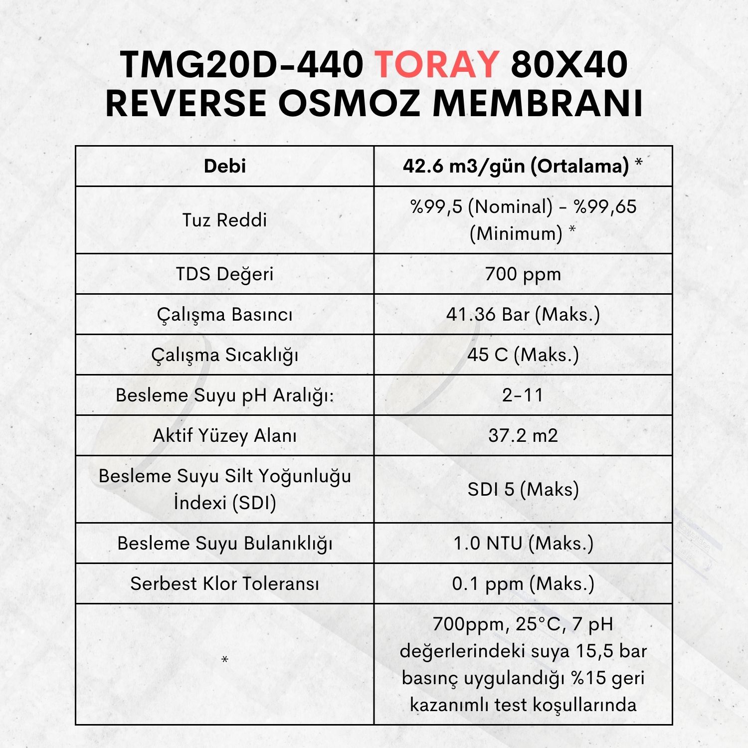 | * | 700ppm, 25°C, 7 pH değerlerindeki suya 15,5 bar basınç uygulandığı %15 geri kazanımlı test koşullarında |